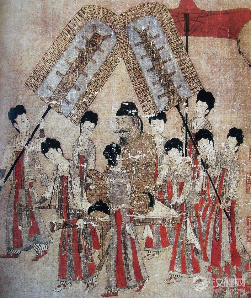 陕西省乾县乾陵陪葬墓张怀太子李贤墓墓道东壁壁画唐景云二年礼宾图中头戴漆纱笼冠的主人,身穿交领大袖衫和下裳,腰系大带,革带挂蔽膝,足蹬岐头履。尤其引人注目的是背向人物背后悬挂的绶带。该物即为钱起《送河南陆少府》诗云“云间陆生美且奇,银章朱绶映金羁”中的“绶”。五品以上官员朝服佩双绶。