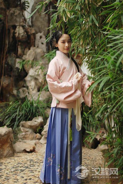 明制女袄、女衫较有特色,外衣多为收袖口的琵琶袖,袖口可有缘边,领子加护领。下裙多配马面褶裙和普通褶裙。女袄衫长度有长有短,有交领、竖领、方领、对襟等。此外,明代的女袄衫和男袄衫一样,也有直袖和箭袖。很多人认为衣掩裙的打扮只在明代存在,其实这种穿法在宋代及以前的壁画中就很常见。无论是衣在内还是衣在外,上衣下裙的两截样式,都是汉族女装区别北方少数民族女装的一大特点。