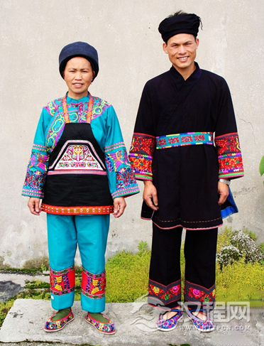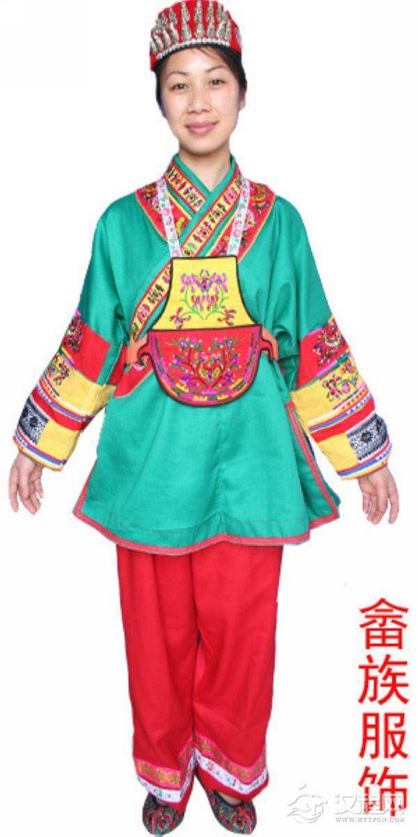 从用色上看,妇女们在创造了理想形象之后,努力追求颜色的浓郁和厚重的艳丽感。畲族崇尚黑色和蓝色,在服饰上以黑、蓝为主调,显得凝重深沉、庄严朴实。在以黑、蓝为主调的基础上,有的加上一点色彩鲜艳的花边或头巾、围腰之类,凭添几分情趣。畲族妇女的彩虹式花襟由五节很宽的蓝、红、白、绿、黑布圈或彩缎镶接而成,有的彩袖颜色却以红、黄、绿、蓝、紫为主。总之,是以彩虹的色彩模式设计的。这其中又包含着一定的象征意义,如蓝代表天空,绿代表草地,红代表太阳等。畲族彩虹式花襟五彩缤纷、色调和谐、美观大方,但不同的地方有不同的表现手法。福建省福安、宁德一带的畲族,在蓝绿色上衣上绣黑色的花纹,衣领上又绣水红、黄、大绿等马牙花纹,沿服饰的边缝镶上一条三四分宽的红布条,边的下端靠袖头的地方有一块绣花的角偶花纹。福鼎一带畲族妇女的服饰更为艳丽,上衣大襟以桃红色为主要色调,加配其他色线,针绣的花纹面积大,花朵也很大。衣领两头下端,靠袖口的地方,有两枝杨梅花,衣领多用水红、水绿作底色,加绣花。袖口配的色边,一条红,一条绿,对比强烈。罗源畲族妇女衣饰的花色都集中在衣领上,由红、黄、蓝、绿、水绿、黑等颜色,有层次、有顺序地排列成柳条纹图案。在上领的黑底上绣一些粗线条的自然花纹,多为水红色和黄色。围身裙的图案花样是以大朵的云头纹样为特征,裙边也有柳条纹图案。畲族衣饰的色彩组合以红绿色为主。“红间绿,花簇簇”,他们把这叫作凤凰妆或公鸡装,自认为是模仿公鸡斑斓的羽毛缝制的。总之,她们非常善于选用多种强烈的对比色彩,但在色彩的安排上,往往不做大面积的对比,而是采用细碎均匀的小面积对比使色彩既富于变化又和谐统一。同时,以很深或很浅的底色和醒目有力的轮廓线去统一这些斑驳多变的彩色点块。这种设色方法,能使色彩多而不杂、艳而不跳。即使是十分突出的块面颜色,也能融于整个色调之中,而不至游离于画面之外。