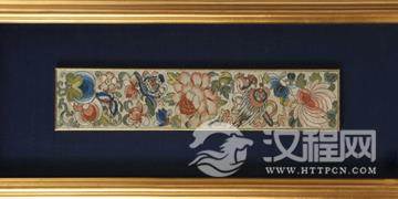 明清时代,织绣艺术大放光彩,经营形式上大胆多样,积极借鉴绘画和其他装饰艺术的艺术形式和特征加以融合,使之丰富绚丽堪称史上之最。此袖口上公鸡与鸡冠花纹饰相配,意喻“官上加官”,步步高升。鹤有一品鸟之称,意一品当朝或高升一品,与松树一起寓意松鹤延年。