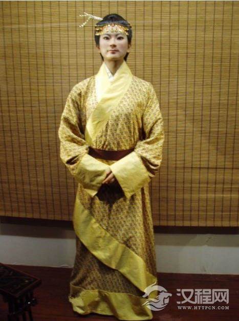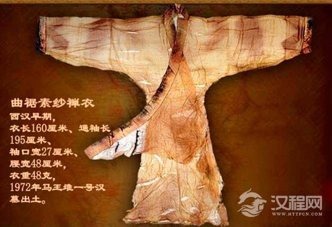 马王堆一号汉墓出土的素纱襌(单)衣,衣长128厘米,通袖长190厘米,由上衣和下裳两部分构成。交领、右衽(rèn)、直裾。面料为素纱,缘为几何纹绒圈锦。素纱丝缕极细,共用料约2.6平方米,重仅49克,还不到一两。是世界上最轻的素纱襌衣和最早的印花织物。可谓“薄如蝉翼”、“轻若烟雾”, 且色彩鲜艳,纹饰绚丽。它代表了西汉初养蚕、缫丝、织造工艺的最高水平。