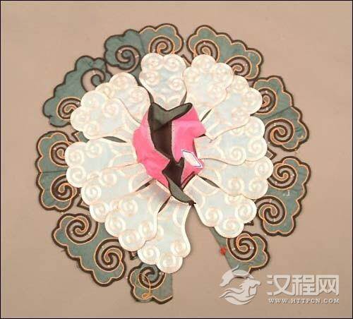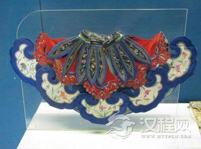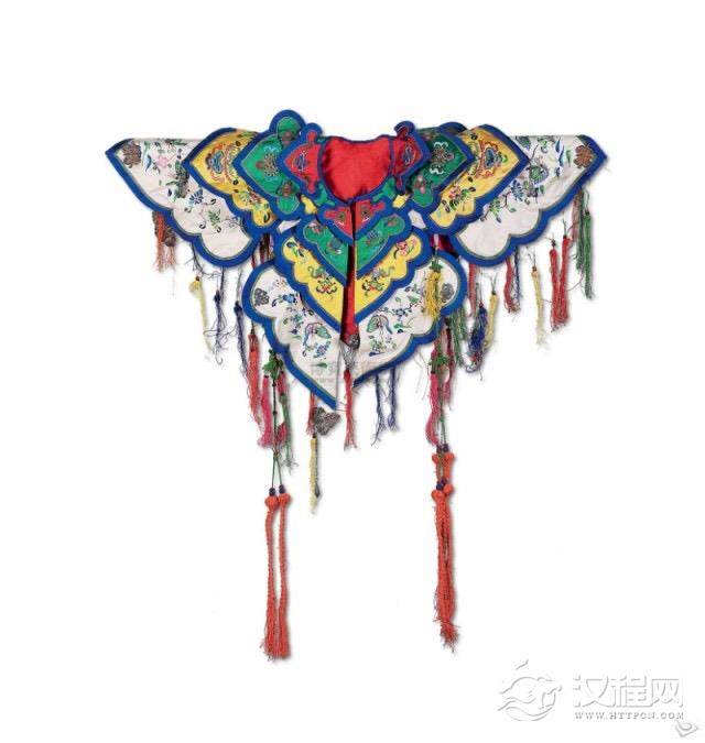 云肩的形式多为“四合如意”形,也有条带状。云肩的制作一般做成两层八片垂云,每片云子上或刺绣花鸟草虫,或刺绣戏文故事。