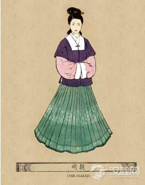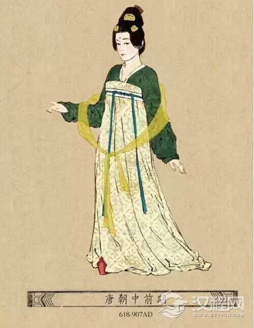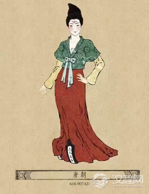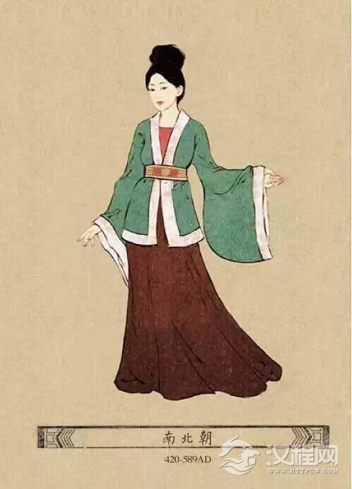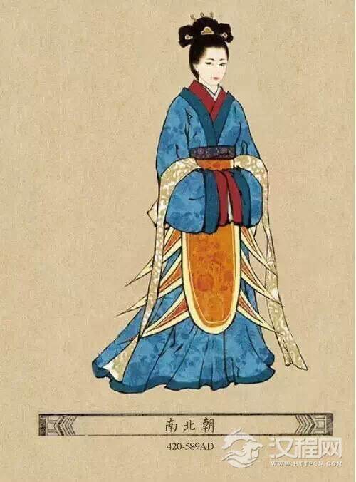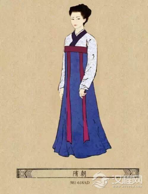 隋统一中国后,文帝一朝社会生活比较简朴。从敦煌壁画贵族进香人,到青白釉墓葬女侍俑比较,衣着式样均相差不多。特征为小袖长裙,裙上系及胸。