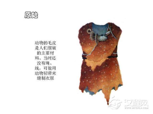 根据出土的骨针、骨锥等制衣工具想象复原的。在纺织技术尚未发明之前,动物的毛皮是人们服装的主要材料。当时还没有绳、线,可能用动物韧带来缝制衣服。在山顶洞人的遗址及其它古墓里,层发掘出大量的装饰物,其中有头饰、颈饰和腕饰等,材料有天然美石、兽齿鱼骨和海里的贝壳等,当时佩戴这些饰物,可能不仅是为了装饰,也许还包含着对渔猎胜利的纪念。