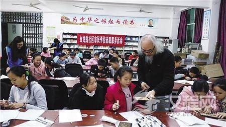 昨日下午4:30,在雷鸣般的掌声中,渝北区龙溪街道金龙路社区市民学校4点半课堂正式开课。民间工艺大师文渝光受邀来到辖区松树桥中学,进行了主题为“非物质文化遗产”知识技能普及培训——竹壳雕刻画的培训,教近百名孩子竹壳雕刻技艺。