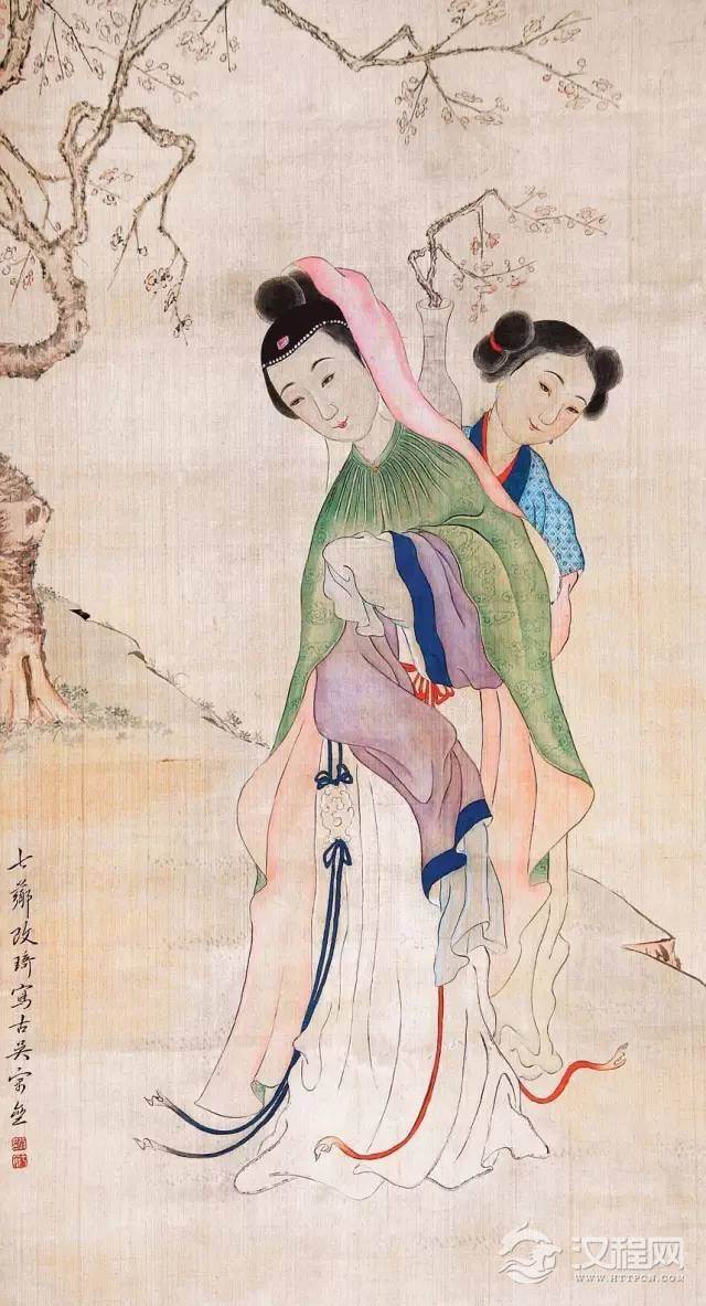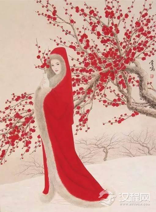 筆記故事《齊東野語》記的紅梅花仙也穿紅衣裙。再說《紅樓夢》中的探春等人,櫳翠庵的紅梅開時不也是穿大紅衣裳嗎?齊白石繪《踏雪尋梅圖》中,紅衣女子手裡就持一枝紅梅。李鳴的《紅梅仕女圖》亦是。