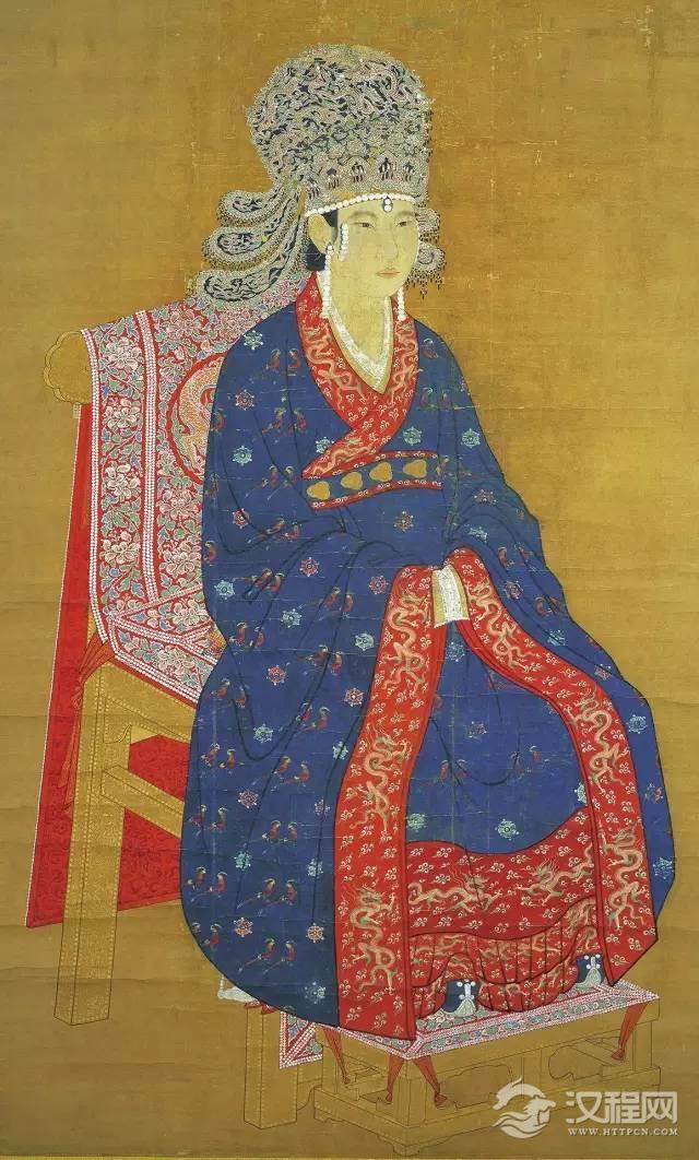 古代天子最高級禮服:冕服,就用了五色。天子的配偶:王后,則有六服,《周禮?天官?內司服》:「掌王后之六服:袆衣、揄狄、闕狄、鞠衣、襢衣、褖衣」。鄭玄註:狄當為翟。也就是翟鳥——紅腹錦雞(《華服美蘊》一書已經指出,翟即紅腹錦雞),毛羽正是紅、金黃、藍、白、白五色齊備,故用來裝飾袆衣、揄狄、闕狄(見)。而且,袆衣為玄色(後改為青色,這裡的青色指藍色)、揄狄青色、闕狄赤色,鞠衣黃色(桑葉發芽之色),襢衣白色,褖衣亦玄色(無翟紋)。宋神宗皇后坐像,穿青色袆衣,上邊有五色的翟紋。