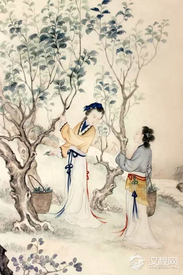 十色之一:曲塵色。曲塵,即酒麴上生的淺黃綠菌色,即緗色,鞠色,桑柳葉初萌芽的黃綠色。是古代王后六服之一:鞠衣的顏色。王后在春天祭祀蠶神,親自採桑葉養蠶,就穿鞠衣。男為天,女為地。黃綠色,桑葉之色,象徵大地、女性,象徵女性蠶桑之功績!正因如此,歷代女子春天都愛用桑葉之色為衣裙,漢代樂府詩《陌上桑》說一位採桑女穿緗色裙:「緗綺為下裙,紫綺為上襦」;唐代詩人劉希夷《採桑》詩也說:「青絲嬌落日,緗綺弄春風」;五代牛嶠《楊柳枝》詞之五:「裊翠籠煙拂暖波,舞裙新染曲塵羅」;楊柳發芽時,也如桑葉色翠,舞姬們要換新染曲塵色的羅裙起舞;廣州通草畫女子養蠶繅絲圖,就有穿黃綠色裙衣的女郎。