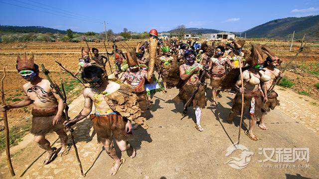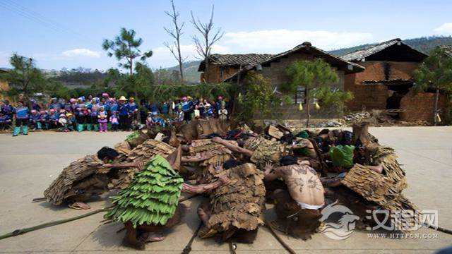 成年男人们赤裸着壮实的上身,他们在身上、脸上涂上浓浓的油彩,头上包裹着一片树棕或树叶,显得粗犷而阴柔,犹如昆明的重彩画一般,鲜活而撩人,下身戴穿棕衣草裙,草裙上都挂着一条张狂的“龙”。挨家挨户送“龙种”,赐福全村人全年好运。