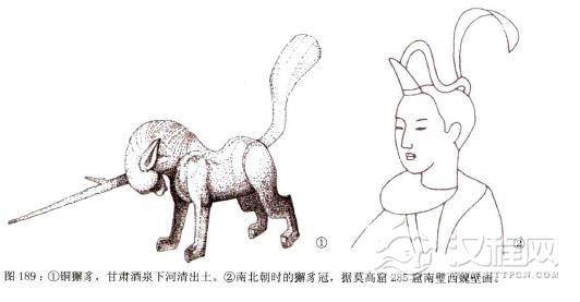 是楚王用一种称为獬豸兽(獬:音同“谢”,豸:音同“志")的角制成的执法官所戴的冠。传说獬身兽是一种类似羊的怪兽。在《异物志》中记载着传说中的这种异兽,它能辨别是非曲直,“见人斗,即以角触不直者,闻人争,即以口咬不正者。”楚王用这神羊的一角,取它“公正”的含义制成执法官的冠饰,意思是让执法者能够公正的辨明是非。《后汉书·舆服志下》:“(法冠)执法者服之…或谓之獬豸冠。獬豸,神羊能别曲直,楚王尝获之,故以为冠。”在《淮南子》中还记述着由于楚王喜爱戴这种冠,使楚国上下风行一时。到了秦灭楚时,秦王把此冠赏赐给近臣、御史,也是想使这些执法者具有其公正意志。在甘肃酒泉下河清出土的一只铜獬豸,独角带刺又称为“独角兽”,在墓葬中随葬此物有镇墓辟邪的作用。到了魏晋时期,这种冠仍为法冠,又名“柱后”。有学者认为,在长沙马王堆一号墓出土的木俑中,大部分都在冠前直立一只角形木棒,也许是獬豸冠的遗风国的遗风。