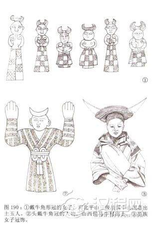 在河北平山三汲战国中山国墓中出土了一些小玉人,他们的头上戴一种角形冠,也是古代保留兽角特征冠饰的一种。这种冠在山西侯马冶铸遗址及西周铜像上也有发现,应是当时较为普遍的冠饰。有趣的是,在现在的苗族中仍能见到这样的头饰。