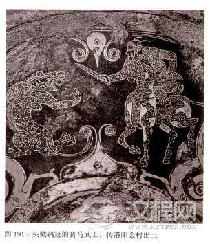 鹖(he,音同“和”)是古书上说的一种善斗的雉鸟,它有黄黑色的羽毛,在争斗中十分勇猛,如果两鸟相争,必将其中之一斗死才会罢休,相传赵武灵王常用这种鸟尾上的羽毛来表彰作战中勇猛的武士。后来惠文王继承父业,继续推广胡服骑射,制成此冠。故史籍中有“赵惠文冠"之名。秦王灭赵后,曾将此冠颁赐给近侍,后来又在此基础上蜕变为武冠,专用于武将及近臣。《后汉书·舆服志》中:“左右虎贲、羽林、五中郎将,羽林左右监皆冠鹛冠,沙谷单衣。”它的冠式形如覆箕,左右各插一枝鸟羽。在洛阳金村战国墓出土的铜镜上,一骑马武士就戴有此冠。