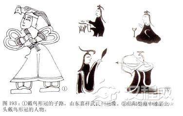 在河南信阳长台关楚墓出土的漆瑟图上,画着巫师作法时头戴一种前有鸟首后有鹊尾的帽子,由于不知其名,我们称它为鸟形冠。有学者认为,在冠的后面有两个翅的可能是用鸟羽做的装饰,以表示其神化的身份。另外漆瑟上绘人物的冠饰中,还有一种侧看像“工”字状的冠,它与曾侯乙墓鸳鸯盒上所绘人物头上的冠式有些类似,多为乐舞人物和习射者。类似的鸟形冠在山东汉画像石中也能见到。