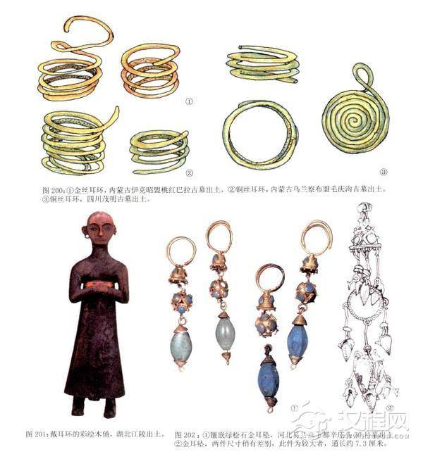耳环多见于北方草原民族地区。一般是用比较粗的金属丝缠绕数圈,很像现在使用的弹簧。在内蒙古伊克昭盟桃红巴拉古墓出土的一对就是这种样式,它由粗丝做成,一只缠绕成三圈,另一只缠绕成五圈,金丝的两头都被磨尖,以便与穿戴。出土时位于头骨两侧。这是北方游牧民族匈奴人的遗物,时间约为春秋晚期。类似的还有在内蒙古乌兰察布盟毛庆沟古墓出土的耳环,是由铜丝缠绕四或六圈而成,时代为春秋晚期至战国。另在北京延庆军都山、辽宁昭乌达盟宁城、河北怀来北辛堡等地的春秋战国墓中,都有这类耳环实物。南方地区的这类耳环稍有不同。如在四川茂名战国古墓出土的一种,虽然也用铜丝缠绕,但却绕成圆盘,像一个圆饼,每只耳环分别绕以七圈铜丝,在末端引出一段弯成挂钩,可能是西南部落民族的遗物。