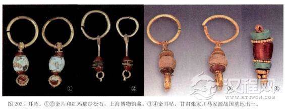 长耳坠类耳饰是北方民族耳饰中最漂亮的一种。1978年在河北易县燕下都出土的战国晚期英国王室贵族妇女佩戴的一对金耳坠,是由金丝弯成圆环并用组金丝包嵌着绿松石和玉珠,是极美丽的耳饰。1992年山东临淄商王村墓地出土的一对战国晚期至秦的金耳饰,由金丝、金环、金片绿松石和珍珠及骨牙串珠等组成造型复杂、工艺精巧,使用了很多的不同材料。这位墓主是被称为“赵陵夫人”的贵族女子,她拥有非常丰富的随葬品,耳坠被放在棺椁外的漆盒中,是她珍爱的饰物。相对较为简单的耳坠多在环状的金圈下缀着金片珠玉,也是很美的饰物。