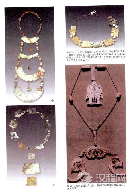 春秋战国时期的项链在不同的地域和时期,风格差别很大。春秋早期,地处中原的贵族们的服饰虽有变化,但仍继承了西周的传统。如河南平顶山市叶县旧县春秋墓葬中,墓主人头部的装饰是用玉组成的发带,还有玉笄与耳玦。脖子上的项链和胸饰精美华丽,漂亮的四璜佩饰和长至胸前的项饰都是极为富贵的象征。