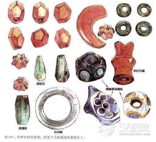而战国时期一般贵族阶层的佩饰则材料多样,同时也不失秀丽。如山东临淄郎家庄一座齐国墓中殉葬的17个青年女子,她们都佩挂着精致的玉组佩,由玉、水晶和紫水晶等饰件组成光彩照人,十分典雅.