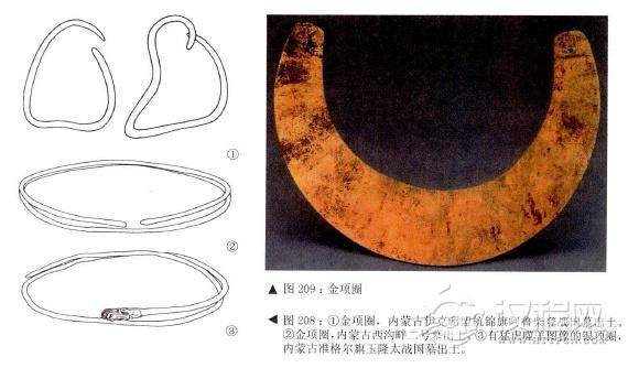 项圈是古代妇女、儿童戴在脖子上的用金属做成的环状饰物。在北方民族地区,成年男子也喜爱戴这类饰物。最早的项圈实物,是1972年在内蒙古伊克昭盟杭锦旗阿鲁柴登战国中期墓发现的两件,都是用0.6厘米粗细的金条弯制而成,每件残长约130厘米,应是古代匈奴人的遗物,与此相同的一件金项圈出于内蒙古西沟畔墓地,只是更长些,出土时绕两圈套在墓主人的颈部,同时在他的头上还戴有精美的头饰和冠饰,应该具有较高的身份。内蒙古准格尔旗玉隆太战国墓还出土一件银项圈,较为精致的当属伊克昭盟瓦尔吐沟墓出土的一件银项圈,它被绕成两圈,在项圈的一端,装饰着猛虎噬羊的图像。