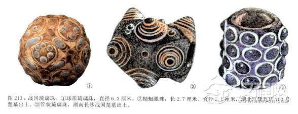 战国的琉璃珠十分独特,典丽迷人。他们多以陶坯为胎,然后在陶胎上用有色玻璃粉绘成图案,再入窑烧制,所以并非全珠都属于琉璃,但烧出来的效果却非常美丽灿烂,战国珠的釉药中,石英的成分较多,所以珠子由于釉料较浓稍有些小泡。琉璃珠大都是以淡绿和淡蓝色为主,为铅、钡和硅酸盐的混合物,纹饰也很丰富。考古发现年代最早、数量最多的是一种叫做“蜻蜓眼”的琉璃珠,这是因为珠上一组组的同心圆纹饰就像是蜻蜓的眼睛凸出在珠子的表面,同心圆圆圈的数量从二、三多至八、九个。圆圈的颜色也多为蓝白相间,但也有棕色和绿色的。每颗珠的“蜻蜓眼”,也大多在八至十几个。一些外国的学者指出,这种被我们称作“蜻蜓眼”的琉璃珠,是公元七世纪之前腓尼基人生产的,并在中亚、西亚、北非等地非常流行时代也比中国早,西方称之为“眼珠”,而佩戴玻璃“眼”珠,主要是为了辟邪,上面的多只眼睛可以帮助人防卫,中国这种类型的琉璃珠是有着外来式样而中国人自己制造的,在伦教琉璃制品也常作为装饰被镶嵌在各类器物上。在湖北江陵楚墓中发现的越王勾践自用锦纹剑,剑珥部分就镶嵌有两小粒透明碧蓝色料珠,由于当时美玉稀少难得,人们还常把它当成宝的替代品,如湖南楚墓中常发现有精美的碧琉璃璧,环等,由此看出,中国烧造琉璃的技术,最晚在春秋战国之际已经成。
