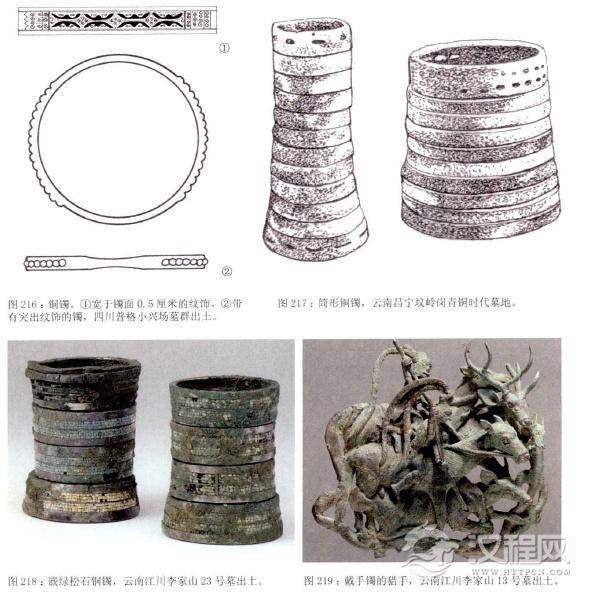而金属手镯则是少数民族戴的较多,主要以铜为主。四川甘孜藏族自治州出土的四件铜镯是用铜条弯曲而成,两端的接头分开,戴时可调节松紧,年代相当于战国时期。四川普格小兴场墓群发现有各式铜镯50件,其中有模具制成的;镯面宽于0.5厘米,在镯面中心还有一条凸出的点状花纹;有用厚铜片弯制而成的一些镯面宽约一厘米,两端连接处用铆钉铆合,一些镯面较宽的还装饰着精美的山字纹、云纹、圆圈纹和锯齿纹等:这个地方现在是彝族聚居区,当时在此居住的主要是邛人,墓葬年代约在战国至西汉初期。