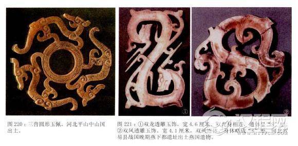 人们思想的异常活跃也使玉饰的造型显得更加生动活泼,工匠们摆脱了商周时期的那种古拙的造型,掌握了自由灵活的雕刻技法,出现了具有复杂曲线并有镂刻精美的雕刻品。如中山国出土的三兽圆形玉佩、河北省易县战国晚期燕下都遗址出土的双龙、双凤透雕玉饰件等都是这类作品中的千古绝唱。