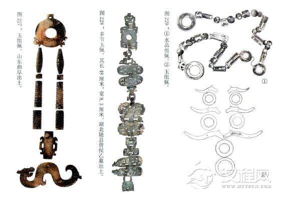 用丝绳或丝带串联的一组玉佩,挂在腰间,走起路来,各种玉饰因相互撞击而发出有节奏的叮咚之声,十分悦耳。如果玉声乱,则说明走路之人乱了节奏,有失礼仪。这就是人们佩戴玉组佩的另一种用途,即礼仪。这种玉佩又叫做“节步”。“节步”是因其步履不同,故佩玉不同,“改其步履之急徐长短,改其佩玉之贵贱”。在先秦时,越是尊贵之人他们的行步就要越慢越短,他们的佩玉则要求长度更长且做工更加复杂精致,以显示佩玉者的身份。到了后来,人们抛弃了礼制的约束,玉组佩完全成了贵族们炫耀身份地位的象征。如在安徽寿县蔡侯墓出土的一组玉佩,从人骨头部直延伸到足部。由玉环、玉管、玉璜、玉冲牙等21枚玉件组成。而在山东曲阜出土的鲁国贵族佩戴的玉组佩,上为一只玉璧,联结玉管、玉珠,最下端为一造型生动的龙形饰,威严而华丽。特别是湖北随县曾侯乙墓出土的一组16节龙凤玉佩饰,采用分雕连接的制作工艺,将五块玉料分割对剖成16节,各节之间再以玉环连成一体,每节均可活动折卷,它设计精巧、雕刻精湛、折卷自如,是目前所见先秦时代玉器中历史、艺术、科学价值最高的上乘佳品。而对于它的使用时有争论,由于它出土时是位于墓主的颌下,所以有人认为它是冠上的饰物“玉缨",在文献中也有楚人“琼弁玉缨”的记载,但其形体之长,体量之宽、分量之重又似乎不甚适合,这些组佩皆气势宏大,做工精湛,代表着当时各诸侯称霸一时、不甘人后的气势。