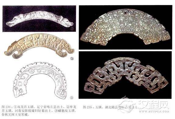 璜形佩,早期的玉璜除了作为礼器和佩饰之中的一个部件之外,也可以单独为饰。形状除了最原始的“形似半璧”外,还有用鱼、鸟、龙等各种动物形象做成弯曲的璜形。其中用龙的形象巧妙制作的双龙首玉璜较为突出,在辽宁省喀左县出土的一件双龙首宝璜是距今五千多年前以龙的形象制作的玉璜。在商周至战国时期,仍沿袭这类玉璜样式。如商代殷墟妇好墓出土的单龙首玉璜,以及一些用龙纹演化而来的蟠虺纹玉璜(蟠:音同“盘”,盘曲而伏,虺:音同“毁”,古书上说的一种毒蛇)等都是这类璜形饰中的佳作,此外其它形式的玉璜也很多见,如陕西宝鸡益门村二号春秋墓出土的类似商周青铜器纹饰的玉璜,湖北随县曾侯乙墓出土的王族所使用的玉璜,都相当精美。