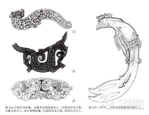 春秋战国时期还流行一种以雕刻龙形、凤形纹饰为内容的玉佩,及龙凤合雕为一体的龙凤佩,这种饰品早在商周时期就已出现。但以龙或凤形象单独出现的年代却相当早,早在距今六多年前的辽西红山文化中,那里发现的十余件玉龙是中国最早的龙的形象,到了原始社会晚期,龙的形像分别出现在不同地区的氏族部落中,其用途也众说纷纭。总之,龙渐渐集合了多种动物的形象特点和多种功能。早期的龙造型简朴有的甚至像一种幼小的动物。到了商周时,龙的体态特征日益明显,并趋于成熟,龙首似曾头,身驱似蟒蛇,越发成为一种神兽。《说文解字》中,龙是“鳞虫之长,能幽能明能细能巨能短能长,春分而能登天秋分而潜渊。”这时的龙己被人们描绘成变化无穷,能上天入海的神奇动物,它的形象也较之以前而狰狞丰满,在当时的各种器物造型中,龙枝经常运用它具有雄性的特征,作为佩玉来佩戴其辟邪作用十分明显。