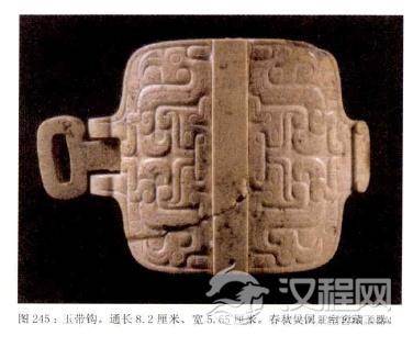 当时的带钩一般由钩首、钩身和钩纽三部分组成,钩首和钩钮分别用于革带两端的连接,使用时先将钩纽卡入革带一端固定住,再用钩首勾结另一端皮带,制作的材料大致可分为玉带钩、纯金或鎏金银带钩、青铜鎏金、鎏银或镶嵌玉或宝石的带钩。在玉带钩中,钩首大多做成螭首。螭是传说中的龙,因此又称为龙钩。带有纹饰的玉带钩十分贵重,其琢制工艺繁复而精致,具有相当高的艺术价值。河北平山县战国中期中山国王墓出土的一件青玉带钩,其首尾各有一个兽头,周身用宛如毫发的细线磨出12组各不相同的纹饰。有人说按照当今的技术条件,这件带钩的制作也需要三个月才能完成。
