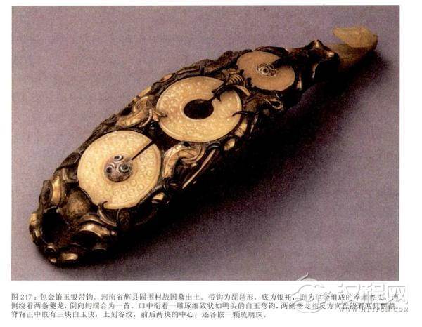 在战国的鎏金银带钩中,钩的造型多做成兽形,如江苏涟水县三里墩出土的一件兽形鎏金银带钩,全身运用了圆雕、浮雕等技法。它的构思是如此巧妙:若从钩首看去,好像是一只蹲坐的怪兽,钩首为头,有着细长的脖颈,钩身为神兽的躯干,并有卷曲的四肢和锋利的钩爪,显示出他威武而安然的神态。若将钩首倒置再看,整个钧身则成为一完整的兽面,上铸鼻眼、大耳,并 有双角兽面的额头上还塑有一对卷曲的夔龙,龙颈相接,龙头左右分开,而钩颈处却犹如神兽口吐的长舌,使人百看不厌。以混合材科制作的带钩,则更加反映出当时工匠艺人无可挑剔的技艺和当时人们极高的审美观念。在河南省辉县固围村战国墓出土的一件“包金镶玉银带钩“,在技术与艺术上达到了极其完美的境界。