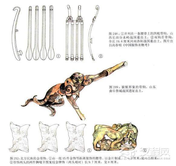 带钩之外还有带饰,即在皮带上等距离镶嵌一些纹饰相同的装饰部件,它们多由金、银、铜、玉等制成,一些带饰上的纹饰很有艺术特色。北方带饰上的装饰多用金片等锤制而成,纹饰多为生动的动物形象。南方的带饰多用青铜制成,纹饰丰富或有花草。