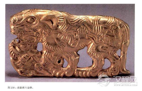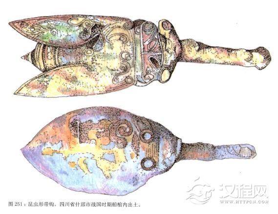 带钩在战国至秦汉时期是如此之流行,工匠们用不同的材料能够制作出万千和不同的式样,有包金,错银,嵌琉璃、玉、绿松石等加工方法,产生不少珍品。特别是各种式样的青铜带钩造型十分奇特。如山东曲阜鲁城战国遗址出土的一件猴手带钩,表现了极为丰富的想象力。而北方草原地区的带钩,多以牌饰的形状出现,并多以动物形象为主,充满了野性的趣味。如“虎狼搏斗金牌"带扣,造型古朴自然。在南方地区,发现于四川省什邡市战国时期船棺内的昆虫形带钩,造型真实古朴。而云南古滇国出土的各种扣饰虽并不全然是带钩,但也是与此相似的饰品,件件如高山之水,自然流出,真实地反映了他们所观察到的事物,是当时生活的写照(参看汉代古滇国)。