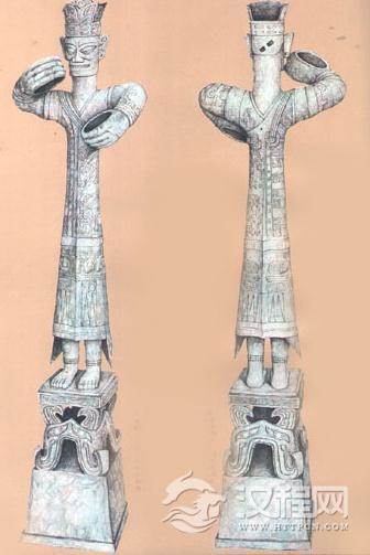 (9)圆领长袖花短衣。配紧身花裤,帽冠。是为中上层贵族衣装。发式高耸呈尖状,十分奇特,沈从文先生认为其发可能用某种胶类胶固成型。头上戴有高冠,冠向后背,且向下卷,周边有扉棱突出。头之后脑部有向上弯曲之突出如虿尾的发髻。长袖窄袖口衣,下着紧身裤,遍饰云纹,臀部有一⊕纹。曲臂,手置胸前,跣足。头发上束成前后双髻,前髻高而向后下卷,后髻略小而突起。冠型高耸,周边有突棱,冠向后卷,身着长袖窄袖口衣,紧身裤,遍饰云纹,臀部也有一⊕纹,又戴一臂环。华冠周边有突棱,冠前后作直角式,与上例异,紧身衣裤饰云纹,臀部也有一⊕纹服饰与上例同,而其华冠比上例高出一倍左右。 头戴冠,冠型前高后卑,前面和上侧有扉棱,后侧平滑,冠身不透空。衣饰云纹。