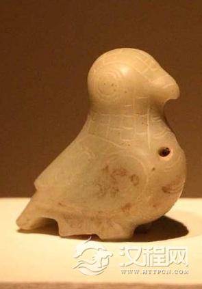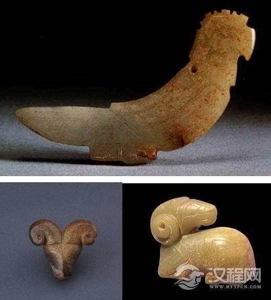 从出土的大量实物来看,作为项饰中穿插的造型丰富的动物形玉饰件,是商代项饰的一个特点。它的种类极多,仅殷墟妇好墓出土的就有:龙、虎、熊、象、马、牛、羊、犬、猴、兔、凤、鹤、鹰、鸱鸮(猫头鹰一类的鸟) 鹦鹉鸟、鸽、鸬鹚(一种俗称“鱼鹰”的水鸟、燕、鹅、鱼、龟、蛙 蝉、螳螂和一些不知名的怪禽,真是天上地下无所不有,精美备至,多数钻有小孔用于佩戴。