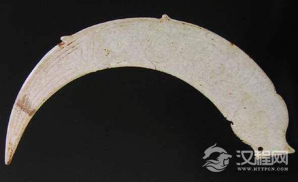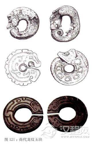 早在原始社会,玦就已经流行于中国的南北各地。以前的玉玦素面无纹者居多,到了商代,人们开始在玉玦上雕有纹饰。在殷墟出土了一些卷龙形玦,它辟邪和通灵的使用观念、外形的样式等都与新石器时代的红山文化一脉相承。红山文化的龙形玦多为圆雕,有的缺囗并未完全打开,环形的背上多有小孔,可以随身佩戴。到了商代,殷人把古人立体的龙形玦做成平板的样式,并用独特的双钩玉刻技法勾画出纹饰,作为耳饰或配饰来戴,成为商周时期极富特色的饰物之一。殷墟妇好墓就出有精美的龙纹玉玦。在一些墓葬中,作为耳饰的龙形玦从墓主头部到脚呈一线展开,颇为壮观。在长江中下游江西新干大洋州发现的一座大型商墓中,出土的玦也是大小有序的排列于腿部两侧,很可能是作为身体佩饰之用。