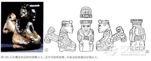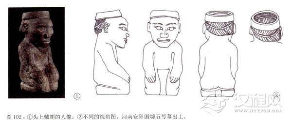华丽的頍还带有漂亮的下垂装饰物。考古学者在河南安阳小屯的商墓中发现了两种这样的冠一种是把帽圈用绿松石点缀装饰之后,下垂—周用玉做成