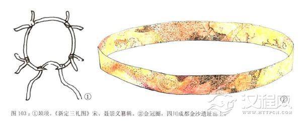 条带状金饰片,而在可能是古蜀国都邑的金沙遗址中,类似的金饰带上还印刻有一些奇异的纹饰,这些都是高贵的頍式金冠圈。金沙遗址中的一件青铜立人像,则头戴一顶十分奇特的环形帽圈,上有13道弧形齿状饰沿其周围边缘插戴,呈逆时针旋转,犹如太阳的光芒,这一环形饰也属于頍。