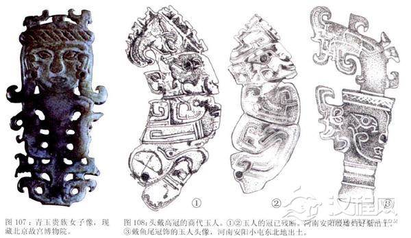 商朝有许多头戴奇异高冠的人物形象。在河南安阳小屯发现了一件残断的玉笄,笄首的装饰是一个藏冠的侧身人头像,冠的顶部装饰着一个倒立的鱼尾形饰物,高高耸起,颇为壮观。在殷墟大幕中也发现了一些这类浮雕人形玉饰,他们头戴一种前高后低,顶为斜面的高冠,冠上透空,周边饰有扉棱。这 样的冠很不寻常,也许是为祭祀所戴。"国之大事在祀与戎”,祭祀在夏、商、周代都是相当重要的事情,所戴的高冠都有不同的名称,《仪礼·士冠礼》中说,这类冠饰在夏朝时称为“毋追”,殷商时叫“章甫“,周朝时又叫做“委貌”,三代异名。冠上都有华丽的装饰,如缀满绿松石片、石管或玉等各类美丽饰品。