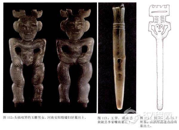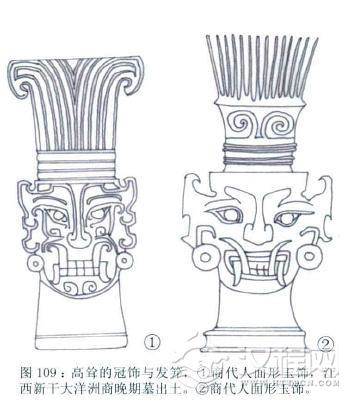 以一组发笄和众多的玉饰品相组合而成。戴这种冠饰的人可能也是与“神”有关的人物。就像商代那些十分凶怪的玉人面,囗中有獠牙,双耳佩环,头上戴着筒形高冠冠顶像扇子一样张开,上面的一组平行的直线纹也许是一组发笄?头发?亦可能为一组羽毛饰。在江西新干大洋洲晚商大墓中,也有类似的形象高筒形冠上竖刻阳线11组的“神人面",应是古代祭祀者戴面具的形象。