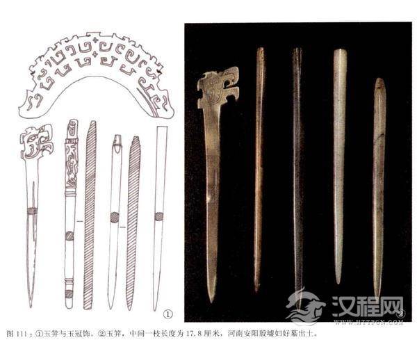 在1977年小屯发掘的一商代贵族墓中,墓主头上方有骨笄25枚,玉笄2枚,呈扇形排列叠压,其中玉笄一枚居中,一枚置于偏右侧,笄丛尖头均朝向人头,龙形笄首整齐顺放,墓主头部还布满极小的绿松石片,应是冠帽上的装饰,而头插双笄应是当时贵族中较为普通的式样。精美的玉屏在其它地区也有发现,它们有的中间有孔,应为固定发髻之用。