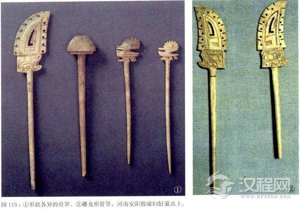 骨笄在商代骨制品中分外抢眼,也是发现数量最多的,约有两千多件,骨质的发算轻巧又美观,是当时人们最喜爱的发饰。在妇好墓中,出土了499枝数量可观的骨笄,造型也繁简不一。制作简单的只在一端刻上几道凸起的线箍,制作精美的则更加注重笄首的装饰,式样有凤头鸟形、鸡形,还有羊形、圆盖形、方牌形及种类繁多的几何纹样。它们中的不少放在一个专门的木匣子里,其中笄首装饰着夔龙形的发笄,是商代后期—种非常华丽的样式,它们以整块肢骨磨成,笄首的装饰占了整枝骨笄长度的三分之一,长度一般在20厘米左。