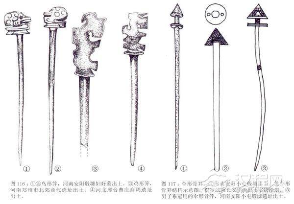 那时的人们还特别喜欢戴鸟形发笄,多是在笄首雕刻成鸡锥或凤鸟的形状,这种用鸟作为头饰的风俗源于古人对鸟与太阳的崇拜,古人认为神奇的鸟在天上飞,春来秋往,自由自在,这对于当时交通不便的人们来说是非常神秘莫测和令人羡慕的。到了后来,鸟被人神话,甚至连商朝的建立也被传说成是鸟的功劳。《诗经·商颂·玄鸟》:“天命玄鸟,降而生商,殷土两茫茫。”这里的玄鸟是指一种黑色的燕子。传说中,仲春之时,有娀氏族的女儿简狄和她的丈夫高辛氏到郊外向高谋求子。这时上天命令玄鸟降下一只鸟蛋,简狄吞食之后不久就生下了商朝的始祖“契”。所以在商朝似乎有以玄鸟为生育之神的信仰。以后春日玄鸟至而“会男女”的风俗一直流传了很久。到了周代,鸟形发笄更加受人喜爱,成为必不可少的发笄式样。这样的发笄在妇 好墓中发现了三十多件,式样大致相同。与鸟形发笄相似的还有鸡形,“笄端:刻鸡形”说的就是此种,与周代的鸡形发笄相比,商代的较为简单,这两种发笄是商周时期最为典型的发饰,在商周交替时,还见有一种精巧的伞形骨笄,这是当时男子戴冠时的冠笄。在一枝圆柱体的骨笄上端,套一个像小伞一样的“帽子”,骨笄与小伞帽可以分开,伞帽的底部有一个槽,正好可以插入笄身,就像人戴草帽一样。些伞形骨笄还在伞帽下部增加一块圆形的骨片,它可以充当“挡板”的作用,这样骨笄在穿过冠孔时就不会滑动,多出在外的一段笄首,还可以用来系缚冠缨。这类骨笄一般都很细长,有的长度竞达37厘米。此外,笄首呈几何形和在笄首镶嵌玉片的发笄也多见于殷墟。