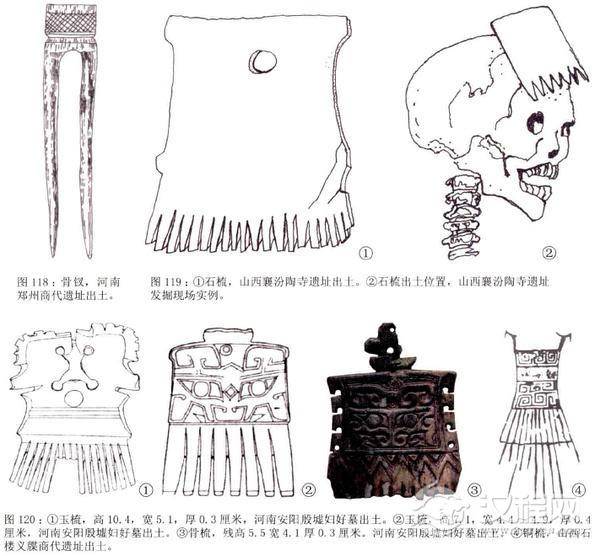 新石器时代,大汶口与良渚文化中高贵的梳子令人难忘。同时,在中国的一些地区还有头戴梳子的现象。山西襄汾陶寺遗址的墓葬中出土了数件石梳与玉梳,有两件梳子出土的位置,都在人骨头部,有的还紧紧贴着头顶。在甘肃永把较高而窄。梳子的材料有骨、玉、象牙和铜。在殷墟发现了两件美丽的玉梳:一件梳把形似两只相对的鸳鸯,另一件则在梳把的两面雕着兽面纹,而精心雕琢的骨梳其精美程度并不亚于玉梳。山西石楼义牒商代遗址出土的一件铜梳,高高的梳把略有收腰,上面装饰着云雷纹。