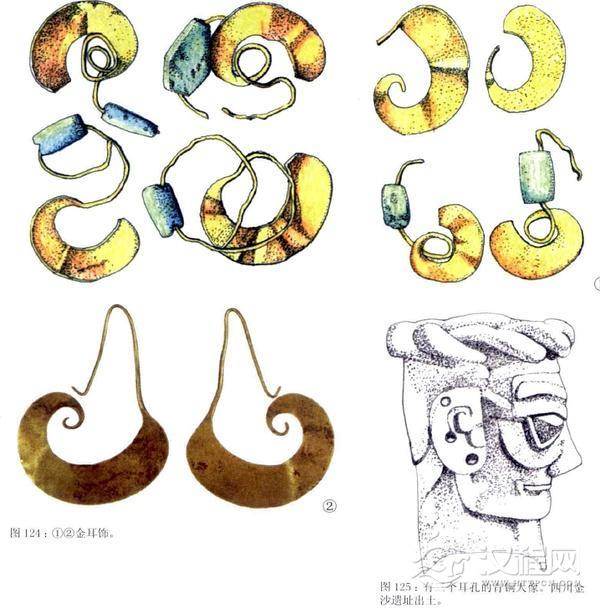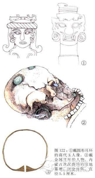 商代晚期,中国西北地区的贵族中还流行一种以两片很薄的金片打制的纯金耳饰。一端是卷曲的螺旋状,另一端收窄成金丝可以穿入耳孔,有的上面还穿一颗绿松石,漂亮极了。它们一般都发现于头骨两侧,常以偶数出现。如陕西清涧沟寺一墓就出土了六件,与之隔黄河相望的山西永和下辛角墓、山西石楼县、洪洞县上村等商代墓中都曾发现过这种金耳饰,陕西淳化黑豆嘴商墓出土的一对,金丝弯钩被拉直,绿松石也已脱落。