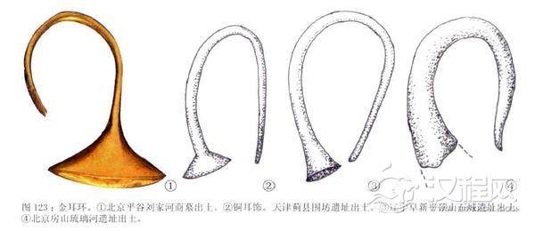 同样古老的耳环在殷人玉雕人物中经常见到。其实金属耳环早在新石器时代就有发现。在1981年发现于内蒙古敖汉旗的周家地墓葬中,一位13岁的男子墓主,他的两耳都戴着金属耳环,左耳环下又用皮条系挂着一只铜耳环。在商周时期的墓葬中,金属耳环多见于辽宁、河北两省,应属于北方草原民族的饰物。这些地方发现的金质耳环看起来也像是玦,它们大小不一,大的直径可以达到12厘米,也许可以作为手镯或项圈使用,直径在4~5厘米之间的小金环就是耳环了。另外,还有一种很特别的喇叭状耳饰。在北京平谷刘家河商代中期墓葬中与金笄等一起出土过一只这样的金耳饰。北京房山琉璃河遗址、天津蓟县围坊遗址和辽宁阜新平顶山石城遗址也有与此相似的铜耳饰。它们的典型特征是将耳环的一端压扁成喇叭口,另一端尖锐便于穿戴,长度约八厘米左右。这类耳饰在中国北方比较流行。