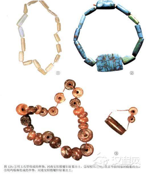 商代的贵族和平民百姓,都很偏重上体的装饰。佩戴项饰的很多,式样也 极丰富各种材料的珠、管项链十分常见。