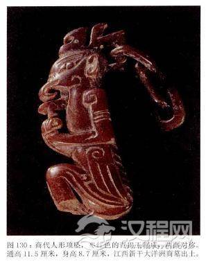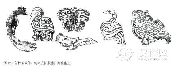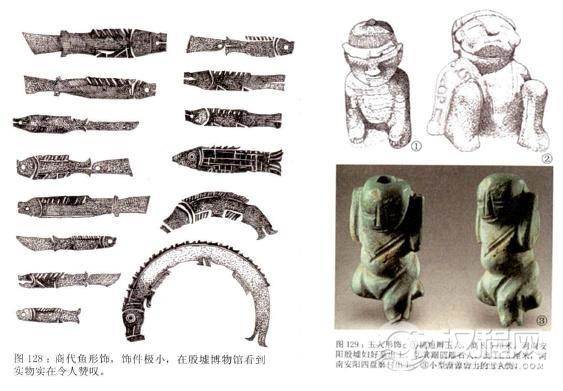 其中各种各样的鱼形饰是商代玉饰品中发现较早的动物形象,仅用阴线刻出鱼的主要部位,鱼身无鳞纹,上有穿孔可以穿系州戴。另有龙形饰和各种小玉人饰也很有趣,特别是那些小玉人,它们造型各异,有的形象朴实,有的怪诞,有些有小孔可以随身佩戴。而中等贵族虽然没有上面那样丰富的小配件,但与此相似的较简单的装饰物也足够精彩1984年发现的殷坡戚家庄一座墓中,墓主的胸前有骨管、玉虎、玉璜、玉螳螂和柄形饰等。商代的平民墓中,有的成年男子佩戴一串由玉珠、玛瑙换和蚌片串成的项链,足端还有 穿孔花骨饰物;有的青年男子佩有每串10枚的两串贝饰;一些儿童颈部戴有玉珠、玉鱼等饰件。从这里,我们也能看到商代明显的等级差别。