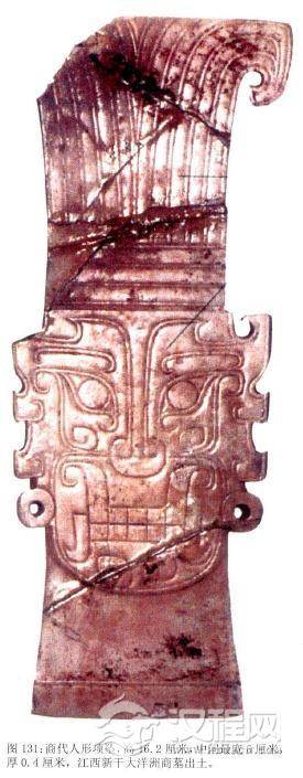 商朝人除了使用磨制漂亮的小玉件随意串联的项饰外,还喜欢制作看起来对称的项饰,颈链虽仍显得古朴,但坠子却更加精美。1989年江西新干大洋州发掘的一座大型商墓中,出土了―串由16件大小不一的独山玉穿成的项链,在墓主的颈胸部位排列成桃形。项链本身十分普通,可在其顶端发现了一件浮雕玉羽人饰件,他侧身蹲坐,戴高冠,头顶后部镂空琢出三个相套的连环。观察它出土的位置和头后的链环应是一件佩饰,很可能就是这串项链的坠子,同地的一座大型墓葬中,墓主胸部的一件人面形玉饰,与两件玉块等饰品组成了一组“佩饰”,这是现今发现最早的组佩,到了西周时期,这种佩饰十分流行,这使过去所知“组佩”始于西周的认识提早到了商代。