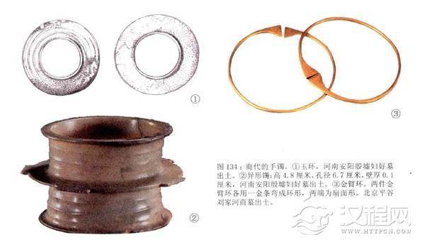 作为手上饰品中的玉琮、臂筒也有佩戴,还有臂戴精工镶嵌绿松石和蚌片的饰物。如在一个平民阶层的青年墓葬中,他的手饰十分有趣,其左臂低一玉璜,右腕有一玉鱼。在北京平谷刘家河商墓中还出有金臂环一对。河北卢县东闰各庄一座商晚期墓葬中也有直径稍小的一对金臂环出土。