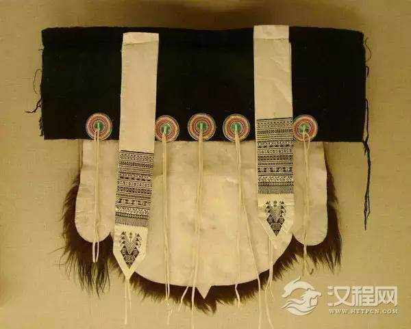 它一般用整块纯黑色羊皮制成,剪裁为上方下圆,上部缝着6厘米宽的黑边,下面再钉上一字横排的七个彩绣的圆形布盘,圆心各垂两根白色的羊皮飘带,代表北斗七星,俗称“披星戴月”,象征纳西族妇女早出晚归,披星戴月,以示勤劳之意。